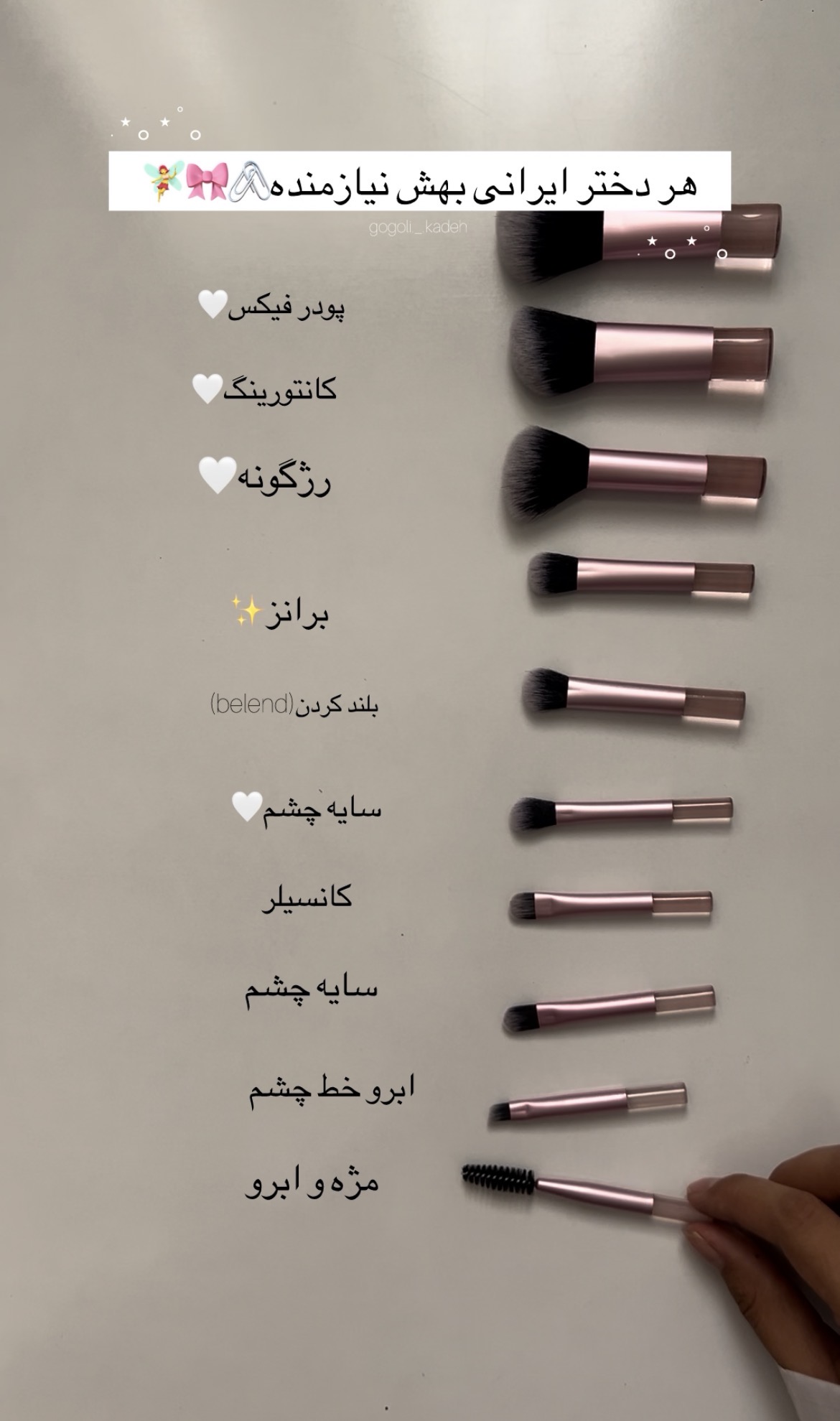 • شامل ۱۰ عدد براش کاربردی 💕🌸مخصوص فید سایه، کانسیلر، رژگونه، کانتور، هایلایتر، پودر و شانه مژه و ابرو